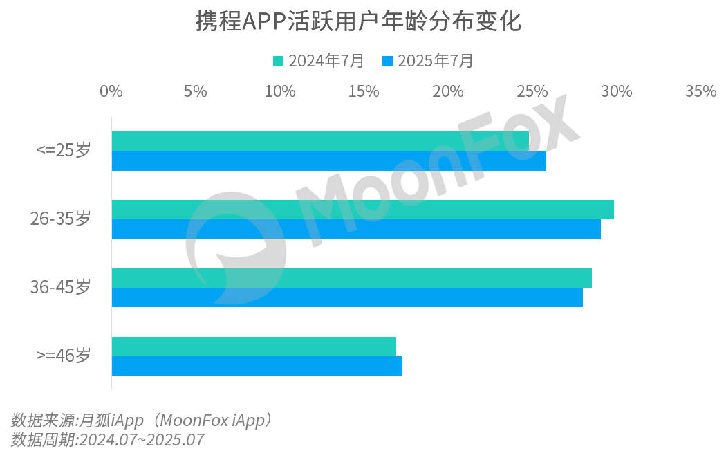 2024年4月,携程正式推出\"老友会\"品牌,面向50岁及以上用户群体提供康养旅居等银发旅游服务。截至2025年第二季度,携程老友会的会员数量及总交易额较2024年底均实现超100%的增长,产品覆盖超50个目的地及国家。300万+的会员规模显示出老龄化市场的巨大潜力。同时,携程面向年轻市场积极拓展\"旅游+娱乐\"模式,以演唱会、现场活动为驱动力,带动相关业务收入在二季度实现超100%的同比增长。根据极光月狐数据,2025年7月携程APP活跃用户中,25岁以下及46岁以上人群的占比相较于去年同期均有显著提高。活跃用户画像的变化态势表明,携程通过服务细分与产品创新,差异化满足了不同年龄段消费者需求,实现在全年龄段覆盖之上进一步优化用户结构,促进收入增长。