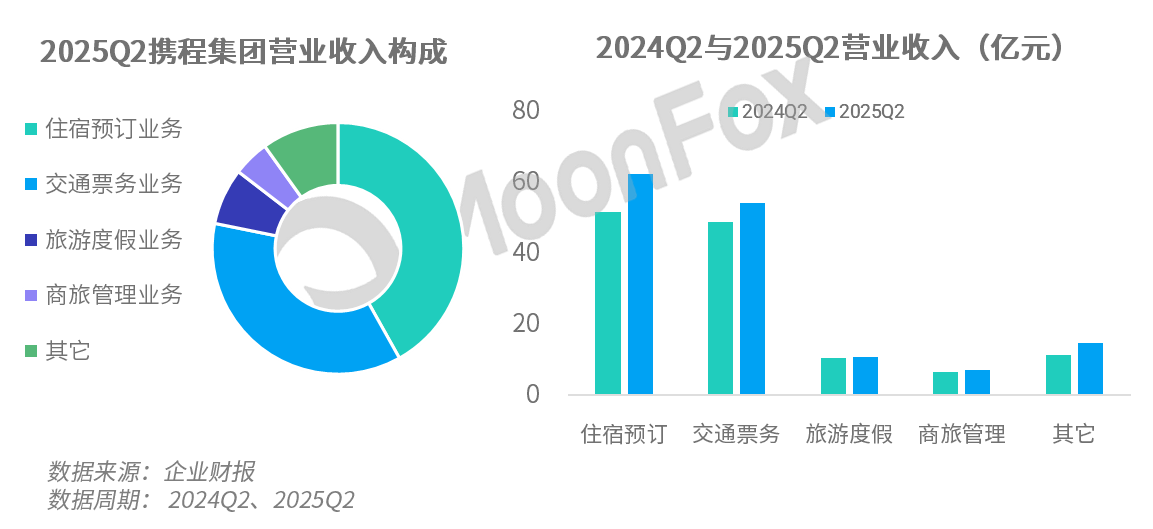 分业务板块来看,携程核心业务均在二季度实现不同程度收入增长:住宿预订业务表现最为突出,二季度收入62.25亿元,同比增长21.20%、环比增长12.34%,成为拉动营收增长的核心动力;交通票务作为携程第二大收入来源,实现收入53.97亿元,同比增长10.80%,环比基本持平,其中国际机票预订量同比增长30%;旅游度假业务收入11亿元,同比增长5.27%;商旅管理业务收入6.92亿元,同比增长9.32%,企业差旅需求的加速恢复成为拉动B端业务增长的重要力量。