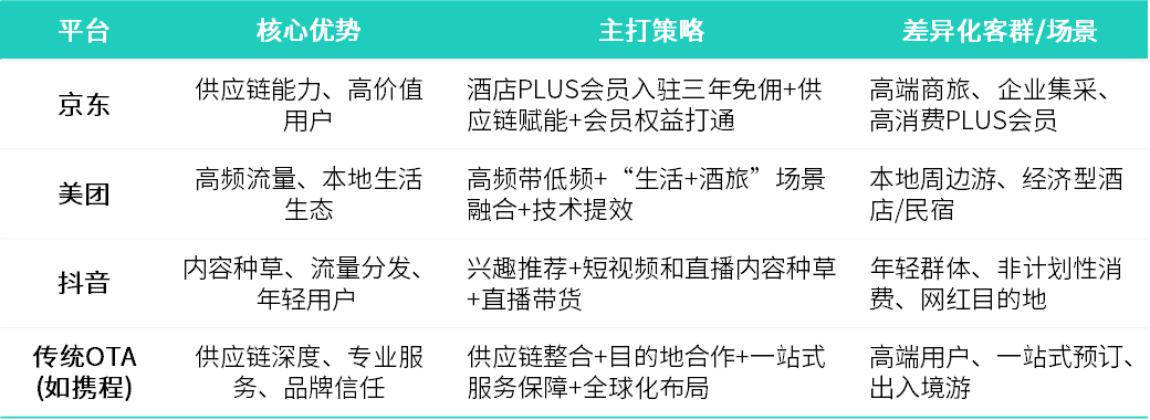 另一方面,传统OTA平台所面临的发展挑战也不容忽视。京东、美团、抖音等互联网巨头凭借流量优势和本地生活服务能力持续抢占酒旅市场,例如京东于618发布\"京东酒店PLUS会员计划\"吸引酒店品牌签约入驻。在市场挑战下,OTA平台需重点巩固自身护城河以应对日趋激烈的跨界竞争。